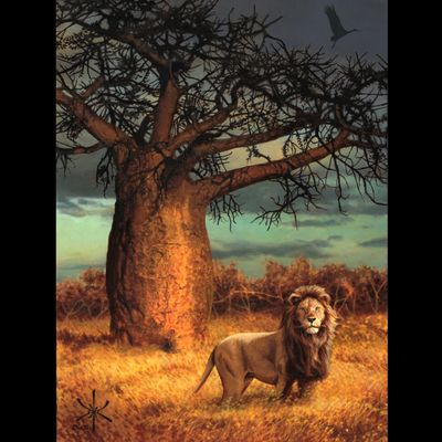 A lion pauses beneath a Baobab tree which offers little shade from the African sun. The wind rises and he sniffs the air for the scent of prey. Instead he smells rain from the coming storm. His search for food will have to wait.